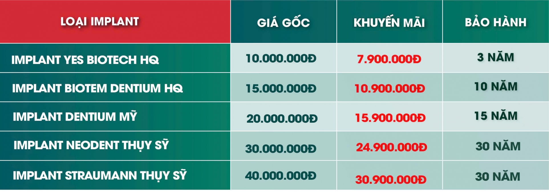 Nhằm đem đến dịch vụ Implant nha khoa tiêu chuẩn Châu Âu cho người dân Việt Nam tại Thái Nguyên mà giá cả hợp lí cũng như chất lượng cao, Italino luôn đem đến những trải nghiệm nha khoa hiện đại mà tất cả chúng ta đều tiếp cận được. Hiện nay phòng khám nha khoa mọc lên rất nhiều nhưng chất lượng vẫn khiến nhiều người do dự, giá cả lại không rõ ràng, nắm bắt được điều đó Chúng tôi cho ra đời Italino với đội ngũ bác sĩ – chuyên gia hàng đầu về Implant, đem lại dịch vụ chất lượng cao, giá cả hợp lý và rõ ràng cho tất cả mọi người. Dưới đây là bảng giá Implant tại nha khoa Italiano