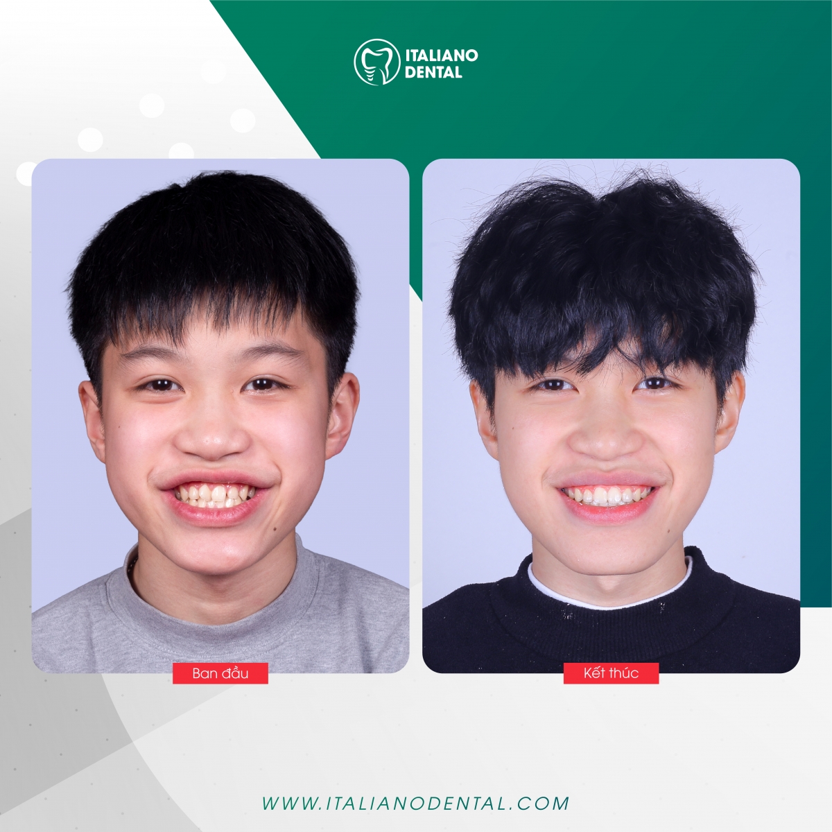 Bạn Hiệp có tình trạng hàm trên răng cửa bị lệch khoảng 45 độ, hàm dưới cũng bị khấp khểnh khá nhiều và bị đưa ra ngoài. Bạn đã quyết định niềng răng năm học lớp 8. Bạn Hiệp có chia sẻ ban đầu thì bạn thấy bình thường nhưng sau khi lên cấp 2 thì bị bạn bè trêu chọc nên cảm thấy ngại. Sau khi niềng răng thì răng cửa đã được xoay về vị trí và nụ cười cũng được đẹp hơn.