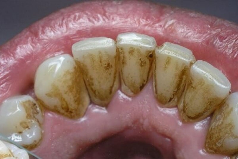 - Do cao răng tích tụ: Đây là một trong những nguyên nhân phổ biến gây ra tình trạng răng bị đen ở mặt trong của răng. Cao răng hình thành do các mảng bám ở bên trên bề mặt của răng và cao răng chuyển hóa thành màu nâu đen sậm do không vệ sinh răng sạch sẽ được.